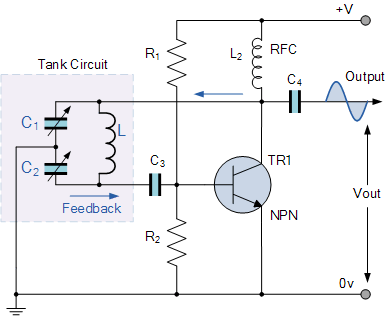Резистори R1 і R2 забезпечують звичайне стабілізуюче зміщення постійного струму для транзистора звичайним чином, в той час як додаткові конденсатори діють як шунтуючі конденсатори, що блокують постійний струм. Радіочастотний дросель (RFC) використовується в колі колектора для забезпечення високого реактивного опору (в ідеалі розімкнений ланцюг) на частоті коливань ( ƒr ) і низького опору на постійному струмі, щоб допомогти почати коливання.