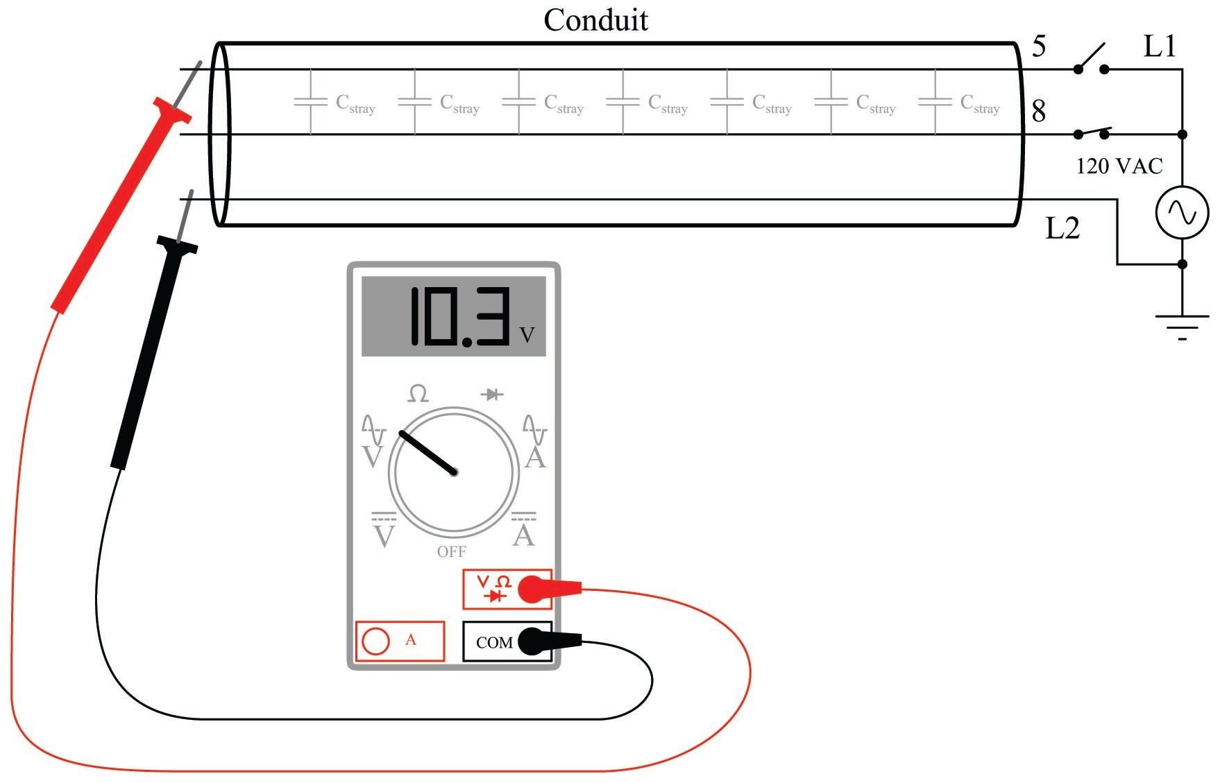 При розімкнутому стані вимикача живлення, що живить провід 5, не повинно бути змінної напруги між проводом 5 і нейтраллю (L2), проте вольтметр реєструє трохи більше 10 вольт змінного струму. Ця «фантомна напруга» виникає через ємнісний зв'язок між дротом 5 і дротом 8 (все ще під напругою) по всій довжині їх загальних шляхів в кабелепроводі. Така фантомна напруга може бути дуже оманливою, якщо технік стикається з ними при усуненні несправностей несправної електричної системи. Фантомні напруги створюють враження з'єднання (або принаймні високоомного з'єднання), де насправді немає безперервності. Наведений приклад, де фантомна напруга становить 10,3 вольта в порівнянні зі значенням напруги джерела 120 вольт, насправді досить скромний. При збільшенні паразитної ємності між провідниками (довші дроти проходять у безпосередній близькості та/або більше одного «сусідного» дроту під напругою) величина фантомної напруги починає наближатися до величини напруги джерела.