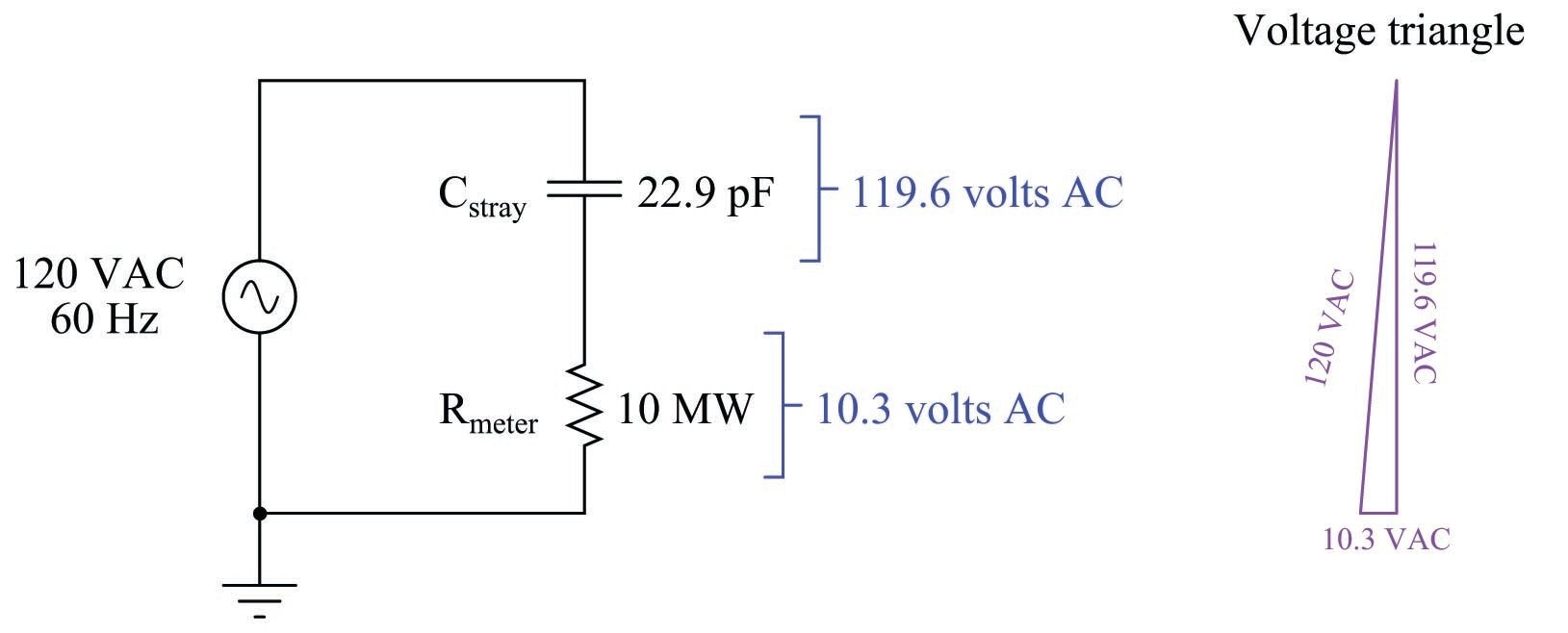 Еквівалентна схема показана нижче, де цифровий мультиметр змодельований як опір 10 МОм: