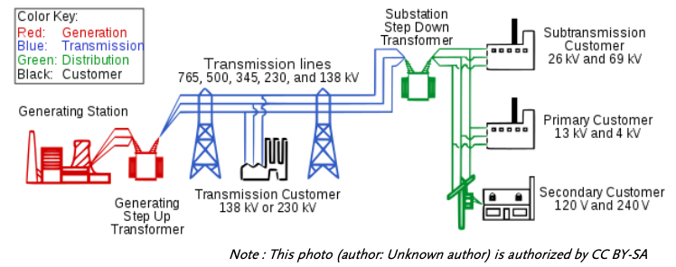 Червоним позначені об'єкти електрогенерації (у тому числі генераторні установки та трансформатори електростанцій, що підвищують); синій - об'єкти електропередачі (мета застосування високовольтної передачі 765, 500, 345, 230 та 135 кВ - зниження втрат на лініях електропередачі); зелений колір є об'єктами розподілу електроенергії; Чорні - споживачі (великі фабрики використовують надвисоку напругу 138, 161 або 230 кВ; середні фабрики використовують надвисоку напругу 26, 69 кВ; дрібні фабрики використовують високу напругу 4, 11, 13, 22 кВ; споживання електроенергії 120, 220, 240В).