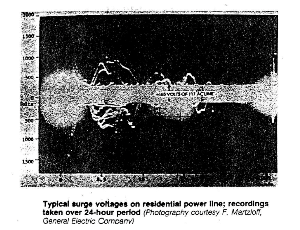 Випробування ізоляційних матеріалів на напругу, що витримується, засноване на максимальній перехідній напрузі, яка може виникнути в місці розташування ліній передачі і розподілу, де знаходиться матеріал. Джерелами перехідної напруги є удари блискавки, наведена напруга (V=L di /dt), викликана індуктивним перемиканням навантаження в лініях, поганим заземленням, електростатичним розрядом (ESD) і усунення несправностей мережі електроживлення. Максимальна перехідна напруга кожної секції системи передачі та розподілу по-різному. Якщо взяти за приклад житлові та комерційні мережі 110–240 В, то перехідна напруга досягне 1000 В (рис. 3). Перехідна напруга протягом 24 годин на лінії електропередач житлового будинку зафіксована GE.