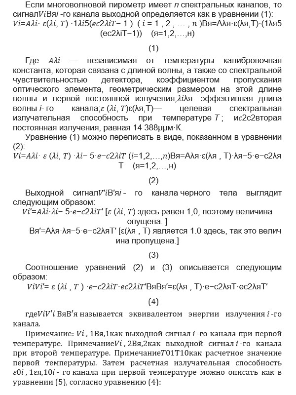 Радіаційна термометрія [1, 2, 3] часто використовує багатохвильовий пірометр (MWP) [4, 5, 6] для подолання обмежень, пов'язаних з невідомою випромінювальною здатністю традиційних одноколірних пірометрів і постійною випромінювальною здатністю в залежності від довжини хвилі для двоколірних піро 8]. Багатохвильовий пірометр може отримати справжню температуру мети без інформації про випромінювальну здатність, використовуючи принцип багатохвильової радіаційної термометрії [9]. Гарднер та ін. розробили шестихвильовий пірометр з матрицями фільтрів для додатків плавлення металів [10]. Хієрно та ін. розробили шестиколірний пірометр з волоконно-оптичним джгутом [11]. Радоускі і Мітчел розробили ультрафіолетовий пірометр для вимірювання ударних температур з напівпрозорим і напіввідбиваючим дзеркалом в 1989 [12]. Левендіс та ін. розробили триколірний пірометр, який використовував одну видиму і дві ближні інфрачервоні довжини хвиль для вимірювання температури поверхні вуглецевих частинок, що горять [ 13 ]. Нг та Фралік досліджували багатохвильовий пірометр зі спектрометром для вимірювання істинної температури прозорих речовин та газоподібних продуктів згоряння [14]. У 2017 році Мей та ін. розробили багатохвильовий пірометр далекої дії [15], який помістив ядро приладу на відстані 100 м від зонда.