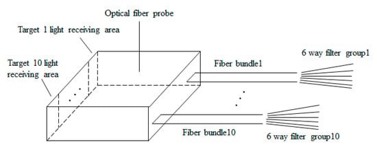Енергія випромінювання мети потрапляє в область прийому світла оптоволоконного зонда після проходження через дзеркало, що обертається, об'єктив і растр. Область прийому світла розділена на 10 цілей, і є 10 каналів пучків оптоволокна, підключених позаду оптоволоконного зонда передачі енергії випромінювання під різні цілі. Відповідно, 6-пучкові оптоволокна підключені до кожного каналу для розподілу енергії випромінювання кожного каналу на шість каналів, і шість каналів енергії випромінювання відповідно оснащені фільтрами різних ефективних довжин хвиль для отримання інформації про енергію на певних довжинах хвиль. Принципова схема структури передачі оптоволокна з 10 каналами на 60 каналів показано малюнку 6. Ефективні довжини хвиль кожного каналу показані таблиці 1 .