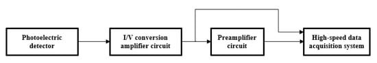 Функція частини схеми полягає у перетворенні енергії випромінювання, отриманої оптичною частиною, сигнал напруги. Після проходження через оптоволокно та фільтр сигнал енергії надходить у фотоелектричний детектор, а потім використовує схему перетворення I/V та схему посилення V/V для посилення сигналу. Нарешті пірометр використовує високошвидкісну систему збору даних для збору даних. Конструкція частини схеми показана малюнку 7 .
