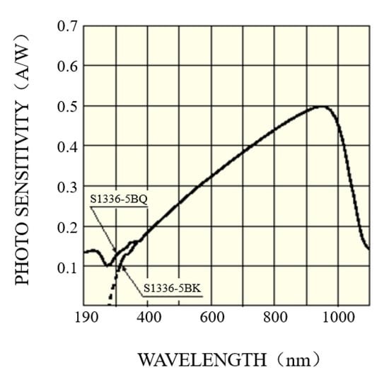 Фотоелектричний детектор використовує матрицю кремнієвих фотоелектричних детекторів. Кожен канал 60-канального оптичного волокна з'єднаний з одним кремнієвим фотодіодом позаду, тобто. всього використовується 60 кремнієвих фотоелектричних детекторів. Модель кремнієвого фотоелектричного детектора - S1336-5BK, із спектральним діапазоном чутливості 0,320-1,100 μм. Залежність фоточутливості від довжини хвилі S1336-5BK показана малюнку 8 [ 19 ].