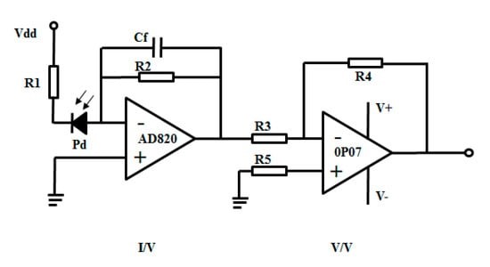 Структурна схема схеми перетворення I/V і схеми посилення V/V показана малюнку 9. Діапазон вибору опору зворотного зв'язку R2 схеми перетворення I/V становить 1–10 МОм, а діапазон вибору ємності зворотного зв'язку Cf становить 1–10 пФ. Вибрана модель операційного підсилювача схеми перетворення I/V - AD820. Схема посилення V/V у 10 разів побудована після схеми перетворення I/V, а обрана модель операційного підсилювача схеми посилення V/V - OP07.