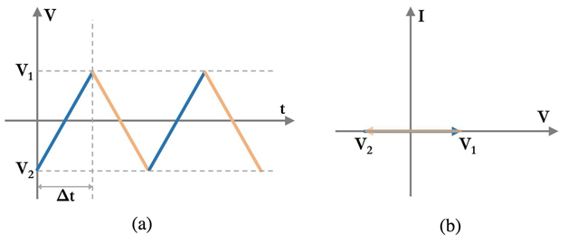 Рисунок 1.1 (a): Лінійна розгортка напруги (В) за часом (t); (b): відповідна розгортка напруги на кривій струм (I) - напруга (V).