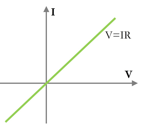 Резистор — це компонент, який є лінійною залежністю між напругою і струмом, що визначається законом Ома, тобто V = I⋅RV = I⋅R. Графічне подання ВАХ рівняння закону Ома є прямою лінією, що проходить через початок координат, як показано на малюнку 2.