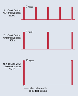 Малюнок 1. Тестові сигнали, що застосовуються, мали середньоквадратичне значення 1 В з коефіцієнтом амплітуди від 5:1 до 10:1.