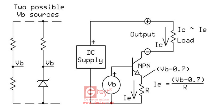 напруга емітера приблизно на 0,7 нижче напруги бази (Vb). Струм емітера Ie