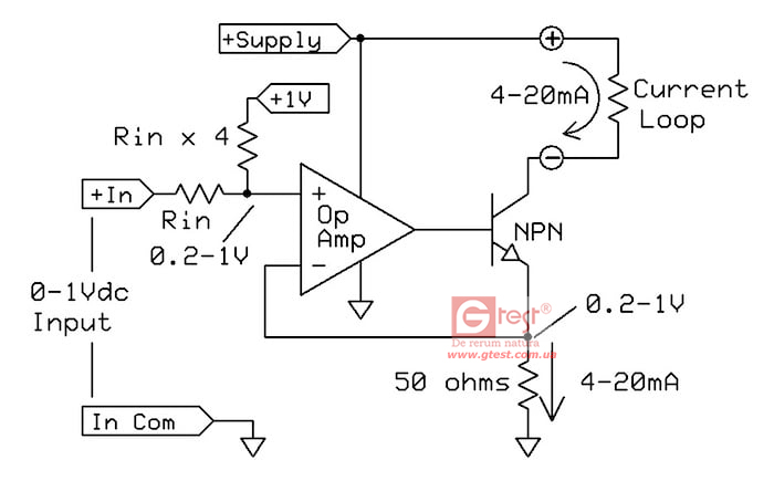 створюючи вихідне зміщення 4 мА. Зворотний зв’язок операційного підсилювача