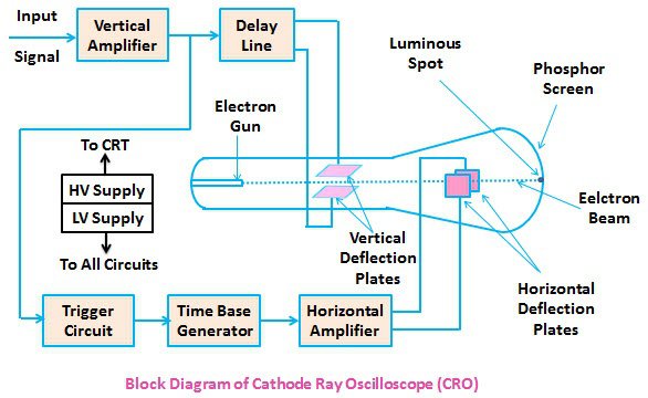 Наступна блок-схема показує загальне призначення осцилографа. Осцилограф використовує електронно-променеву трубку (ЕЛТ) і виступає як нагрівач осцилографа. В осцилографі ЕЛТ генерує електронний пучок, який прискорюється до високої швидкості та потрапляє у фокус на люмінесцентному екрані. Таким чином, на екрані з'являється видима пляма в місці влучення електронного пучка. Виявляючи пучок над екраном у відповідь електричний сигнал, електрони можуть діяти як електричний світловий олівець, створюючи світло у місці влучення.
