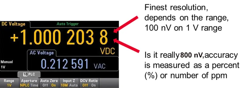 Давайте подивимося на малюнок 4 нижче, остання цифра дисплея DMM, число "8". Оскільки ми знаходимося в діапазоні 1, число «8» означає 800 нВ. Отже, в діапазоні 1 В ми маємо роздільну здатність 100 нВ. Однак питання полягає в тому, чи справді фактичне значення становить 800 нВ чи наскільки близько 800 нВ до фактичного значення? Близькість 800 нВ до фактичного значення – це те, що ми називаємо точністю. Ми можемо сказати, що 6 ½ розрядний цифровий мультиметр із високою точністю не кращий і не гірший, ніж 5 ½ розрядний цифровий мультиметр із хорошою точністю, навіть якщо ми отримуємо більшу роздільну здатність від 6 ½ розрядного цифрового мультиметра.