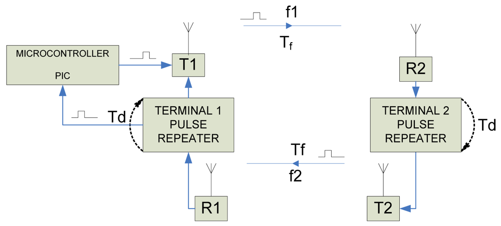 Наш прототип, зображений малюнку 1, і двох різних терміналів, розташованих обох кінцях вимірюваної відстані. Кожен термінал складається з трьох різних елементів: 1. Передавач радіочастотних імпульсів (T1 і T2 на малюнку 1), 2. Моностабільна інтегральна схема, необхідна для повторення та затримки імпульсу (повторювач імпульсів) та 3. Приймач радіочастотних імпульсів. (Р1 та Р2). Крім цих елементів, Термінал 1 включає простий мікроконтролер (рис. 5), завданнями якого є: