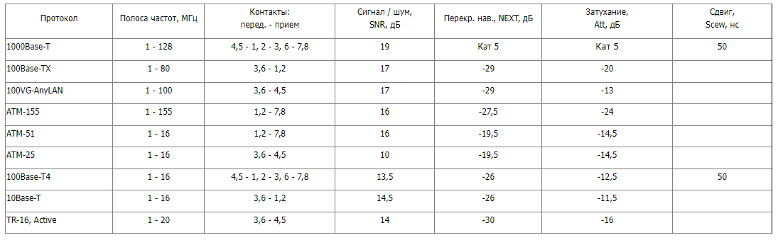 Середовище передачі локальних мереж має забезпечити роботу протоколів з коефіцієнтом помилок (BER - Bit Error Rate) трохи більше 10-10. Для цього потужність сигналу та його перевищення над потужністю шумів для робочих пар у ефективній смузі частот має бути в межах значень, визначених для кожного протоколу. Слід звернути увагу, що смуга частот найважливіших додатків перевищує частотний діапазон СКС. Для ATM-155 потрібно 155 МГц, для 1000Base-T – 125 МГц, а категорія 5/клас D забезпечують всього 100 МГц.