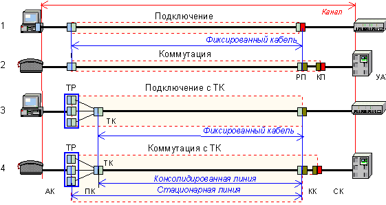 АК – абонентський кабель, КК – комутаційний кабель, СК – мережевий кабель, ПК – перехідний кабель,
