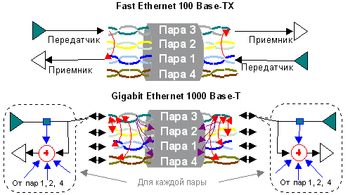 На малюнку 3 показані схеми передачі протоколів Fast Ethernet 100 Base-TX та Gigabit Ethernet 1000 Base-T. До появи протоколів, що задіяли всі чотири пари, достатньо було врахувати загасання сигналу (Attenuation) та перехресні наведення (NEXT), зображені червоними стрілками. Якщо працюють лише дві пари, виникають дві наведення NEXT, що впливають на роботу приймачів на кожному кінці лінії. Протоколи використовують різні пари, тому при тестуванні перевіряють усі можливі комбінації – по шість перешкод для обох кінців лінії/каналу.