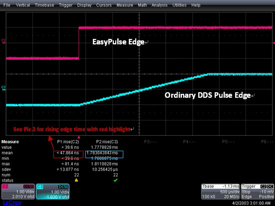 1. Як показано на Мал. 1, EasyPulse забезпечує більш швидкі фронти імпульсу (6 нс.), причому фронти імпульсу DDS значно повільніше (на мілісекунди).