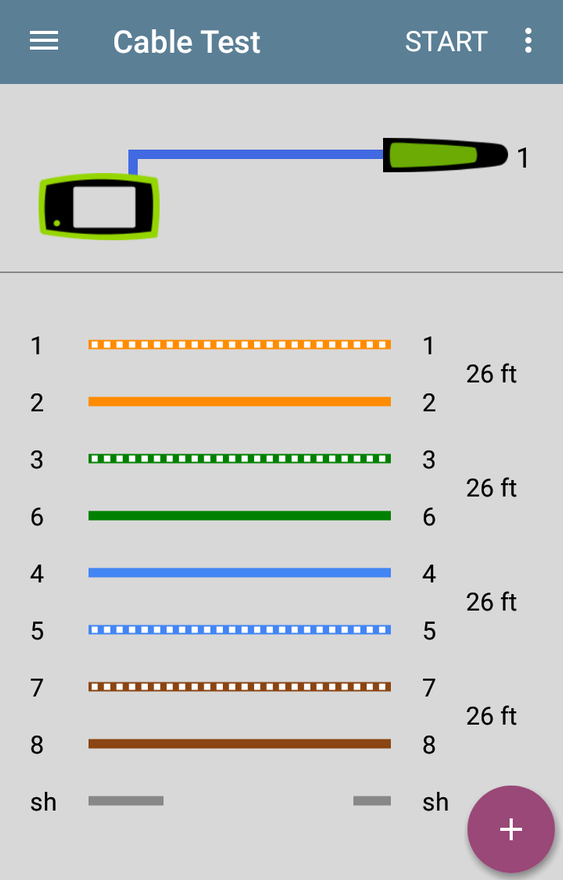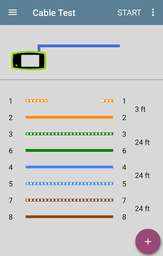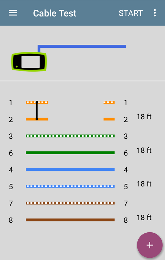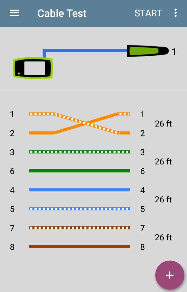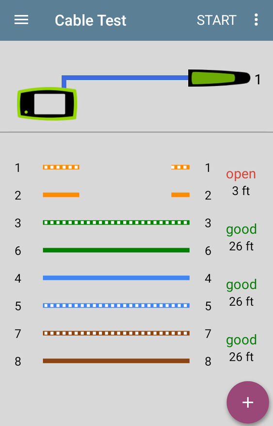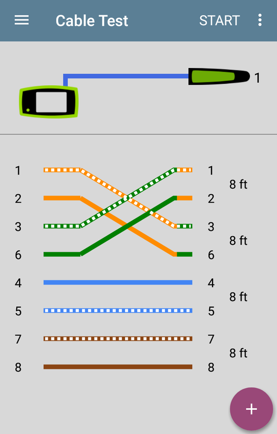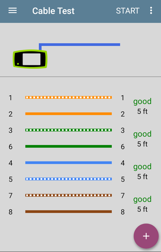 ДОБРЕ — якщо пристрій завершує тестування та відображає пари кабелів та їх довжину, значить, розпинування контактів відповідає очікуваній конфігурації схеми розведення відповідно до стандарту TIA/EIA 568. На зображенні нижче показано тест із використанням вбудованого порту WMAP, який виявив справний кабель.