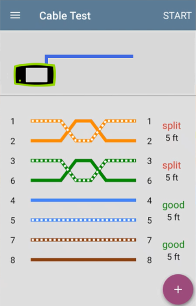 РОЗДІЛ: про розділені пари повідомляється, якщо довжина кабелю становить не менше 2,6 футів (0,8 м). Результат розділення відображається кожного разу, коли тест показує, що два дроти в парі не були скручені разом для забезпечення стійкості перешкод на всій довжині кабелю. При тестуванні нероз'ємного кабелю поруч із розділеними парами відображається червоний текст "Розділ". Через характер розділених пар і використовуваного методу виявлення довжина розділеної пари може бути неточною.