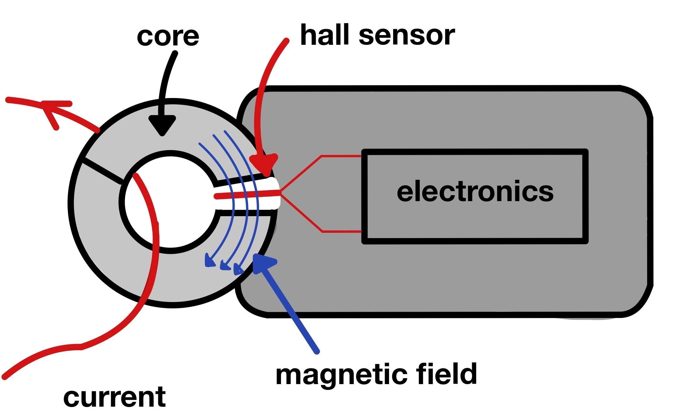Датчики Холла належать до них. Ви можете побачити структуру такого струмового затискача постійного струму з датчиком Холла на схематичному малюнку: