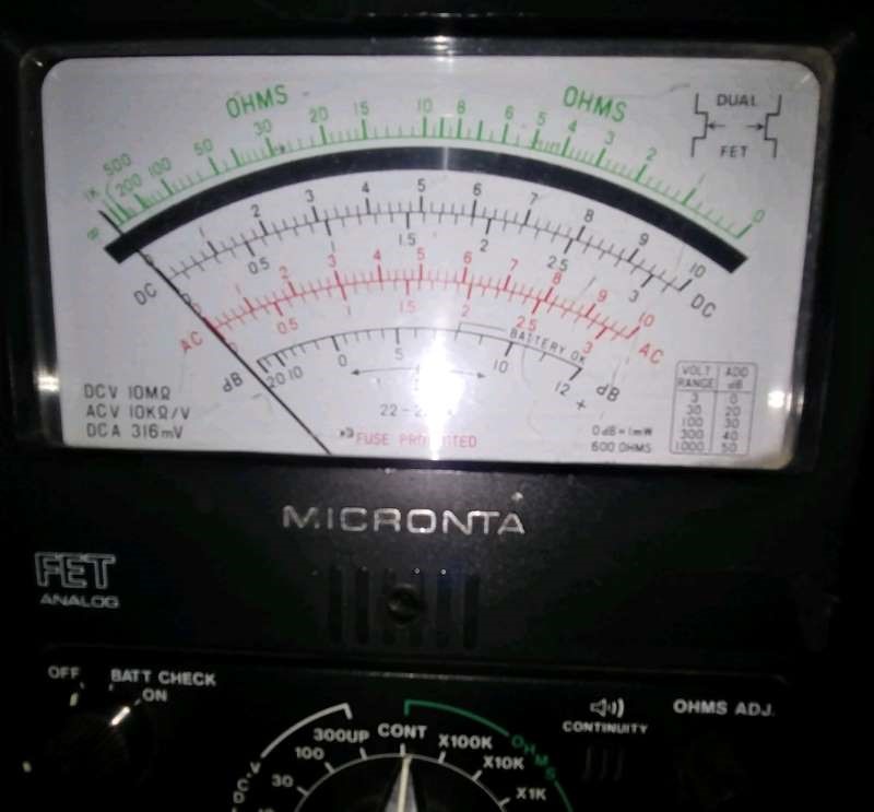 Малюнок 2. Модель аналогового мультиметра Micronta з фіксованим опором постійної напруги, але зі змінним опором змінної напруги (видно в нижньому лівому кутку).