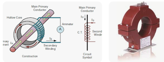 Трансформатор струму знижує струм із високого до низького струму для вимірювальних цілей. Фактично це неефективний трансформатор, що підвищує, з великим повітряним зазором між первинною і сердечником і вторинною обмоткою. Один або кілька витків у первинній обмотці та 50 або більше витків у вторинній обмотці. Вторинна обмотка трансформатора струму ПОВИННА бути завжди підключена до амперметра або закорочена перемичкою. Розімкнений вторинний ланцюг призведе до ДУЖЕ високої та небезпечної напруги.