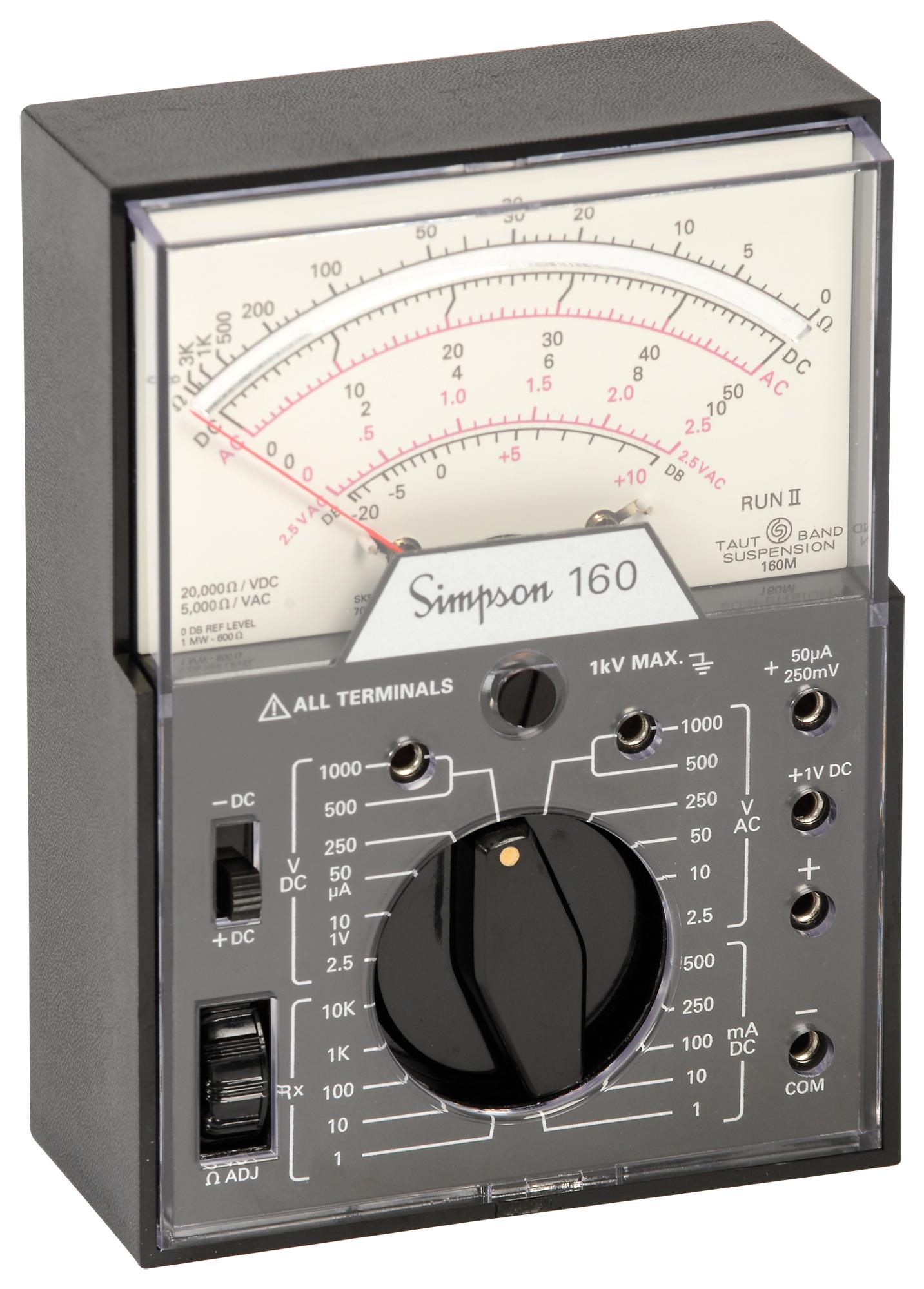 Модель 160 від Simpson, що входить в серію мультиметрів 160, має максимальний струм 0 А змінного струму та 0,0005 А постійного струму та максимальну напругу 1000 В змінного струму та 0,001 В постійного струму. Мультиметр має максимальний опір 30 Ом і може вимірювати ємність, температуру та частоту.