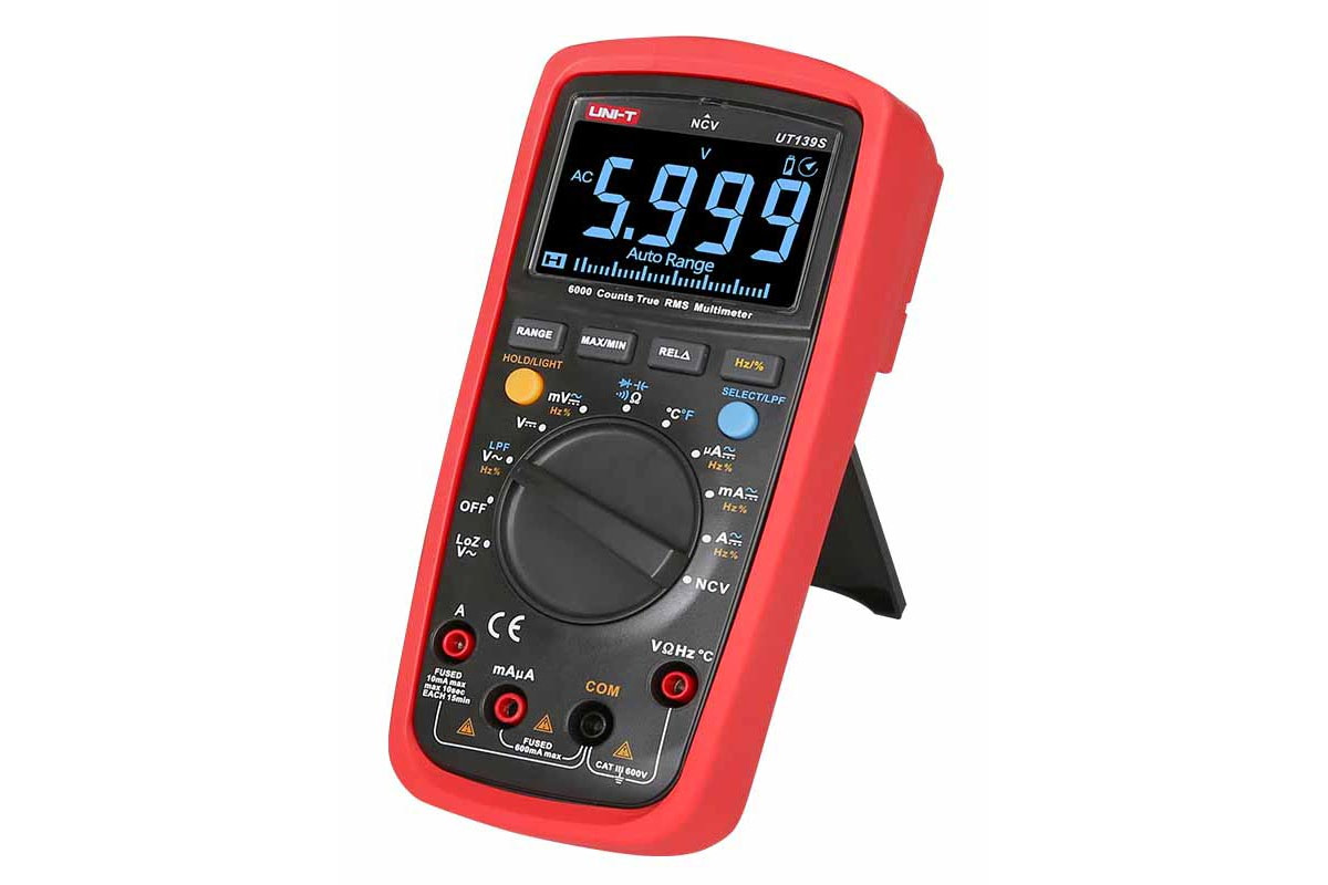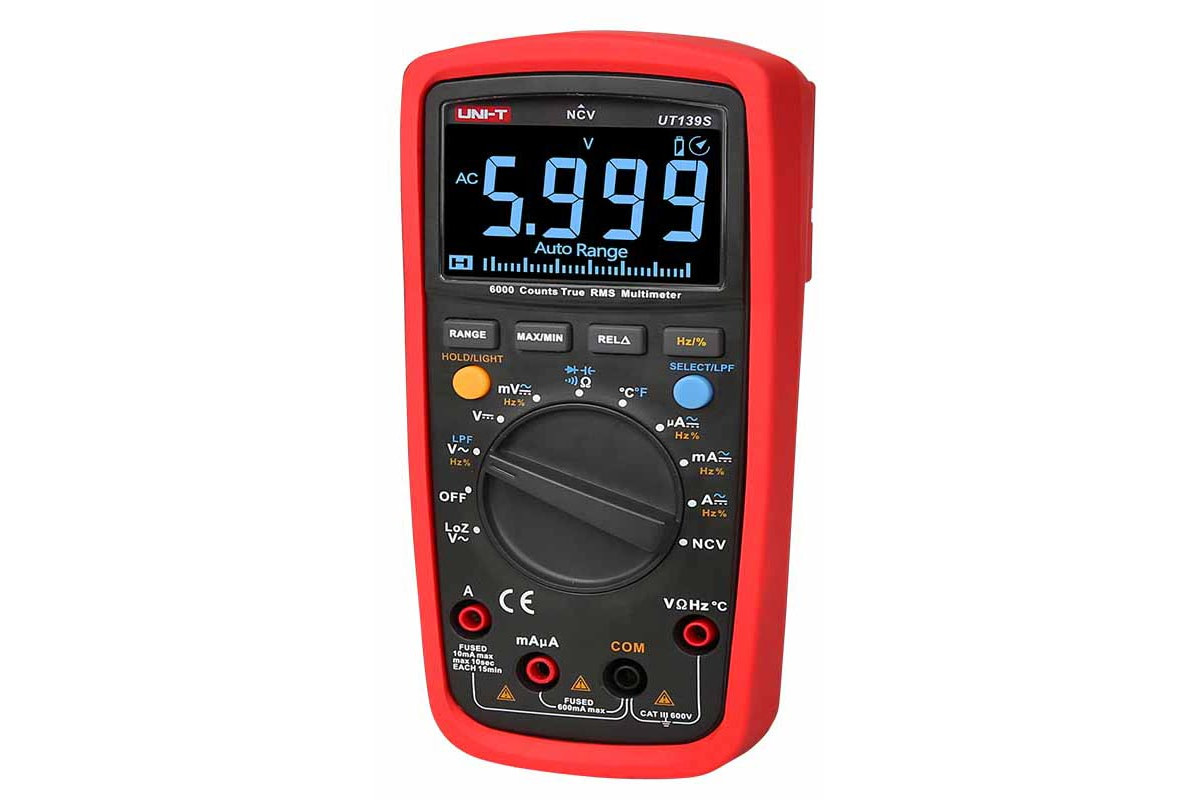 Мультиметр UT139S оснащений функціями автоматичного та ручного режиму вибору діапазону вимірювань, вимірювання True RMS, тестування діодів та перевірки цілісності ланцюга зі звуковою індикацією, має смугу пропускання від 45 Гц до 1 кГц , АЦП на 6000 відлік на дисплеї, функцію максимальних та мінімальних значень. Дана модель призначена для електриків і має такі особливості та спеціальні функції: ступінь захисту CAT III 600 В, великий EBTN дисплей з чорним фоном, що ідеально підходить для роботи в темних умовах, 31-сегментна аналогова шкала, що дає найкраще візуальне представлення результатів вимірювань , функція низькочастотного фільтра LPF , функція детектування високої напруги NCV , функція низькоімпедансного входу LoZ .