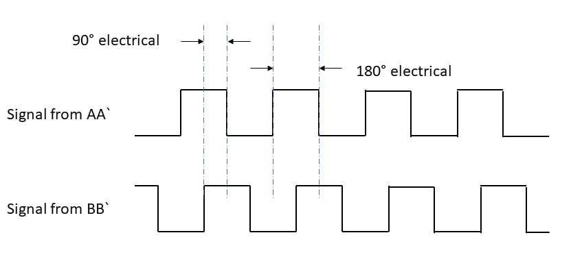 Для перевірки енкодера необхідний осцилограф. Осцилограф - це випробувальний прилад, який відображає змінну напругу, що підлягає тестуванню, на двовимірному графіку в залежності від часу. Їх можна використовувати для спостереження та порівняння амплітуд, частоти та напрямки сигналів від енкодера. Вирізи на дисках переривника влаштовані таким чином, що вихідний сигнал одного каналу в рівні проміжки часу буде високою та низькою напругою. З цієї причини вихідний сигнал енкодера можна спостерігати у вигляді прямокутної хвилі з коефіцієнтом заповнення 50-50. Робочий цикл є частка періоду, протягом якого сигнал активний, де період відноситься до часу, необхідного для завершення циклу включення-вимикання. Два канали в дисках переривника сконструйовані таким чином, що вони зміщені один від одного на 90 °. Це зміщення допомагає розрізняти обертання ротора за годинниковою стрілкою та проти годинникової стрілки. Одна секція високої чи низької напруги відповідає 180° електричного обертання. Половина цього робочого циклу відповідає 90 ° електричного обертання. Вихідні кабелі енкодера підключаються до двоканального осцилографа для спостереження за формою вихідного сигналу і мають виглядати так, як показано на малюнку 2.