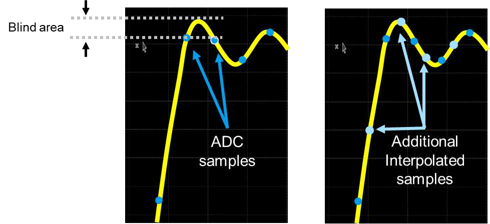 Малюнок 10. На відміну від аналогових побратимів, цифрові тригери здатні використовувати інтерполяцію між точками вибірки, щоб виключити області, які інакше, були б сліпі для запуску. Це призводить до підвищення чутливості тригера до величини 0,0001 справ.