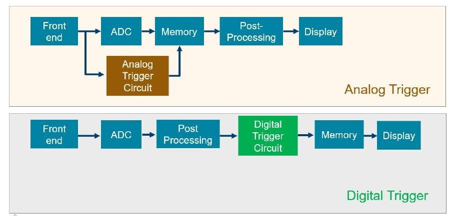 ► Керування гістерезисом: якщо прилад дозволяє встановлювати широкий діапазон величин гістерезису тригера, від найбільшого до найменшого (тобто від 5 поділів до 0,01 поділу), це цифровий тригер. Аналогові тригери не мають здатності вибирати з декількох встановлених умов, відповідно, користувачі не мають повного контролю над гістерезисом.