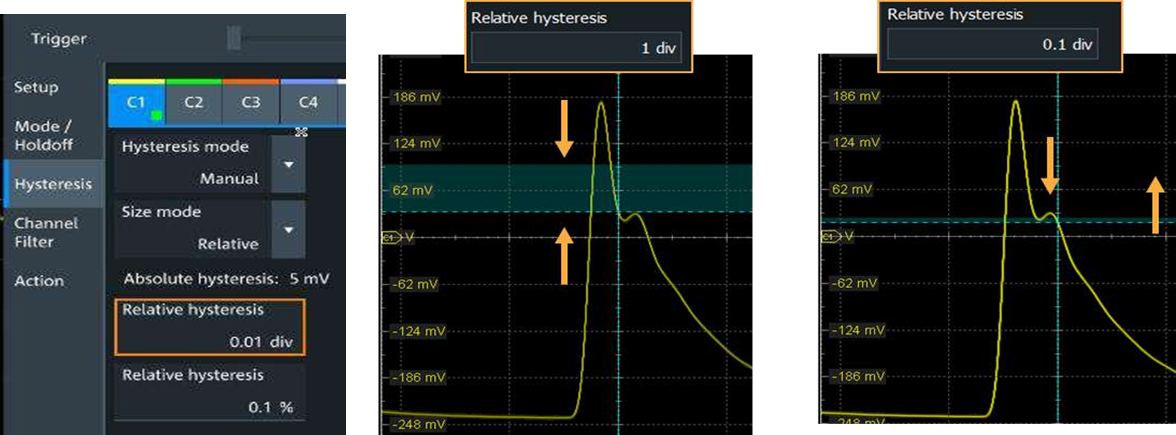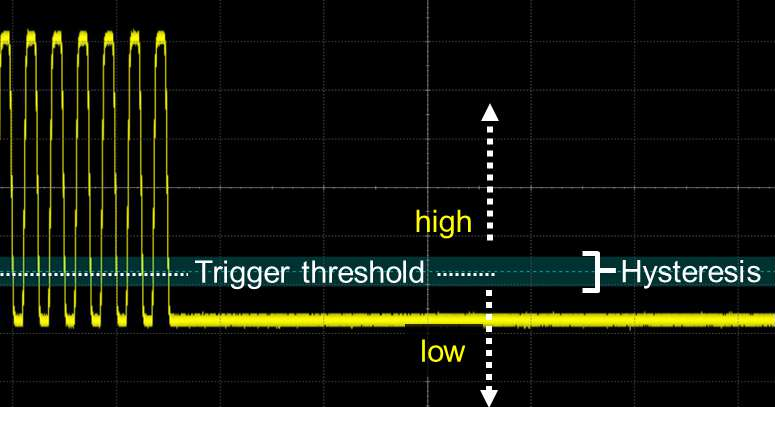 Користувачі визначають поріг запуску тригера і можуть контролювати значення через обертання відповідної ручки або встановлюючи рівень спрацьовування в діалоговому вікні. Коли сигнал проходить виставлений поріг, він обов'язково повинен перевищити пороговий рівень на певну амплітуду, щоб осцилограф зафіксував цю зміну як подія запуску. Гістерезис тригера - це додаткова величина амплітуди, що перевищує зазначений поріг тригера.