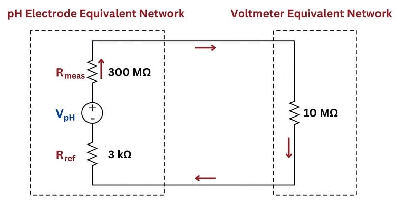 Тільки невелика частина напруги скляного електрода (VpH) буде фактично помітна на клемах вольтметра через цей ефект навантаження. Ми можемо розглядати внутрішній опір вольтметра 10 МОм як один опір мережі дільника напруги, причому два опори пробника є двома іншими опорами дільника: