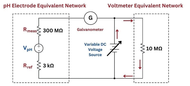 Поки гальванометр реєструє нуль («нульовий» стан), електричний струм не проходитиме через великі опори електродів датчика pH, тому що напруга pH датчика ідеально збалансована з напругою змінного джерела живлення. За відсутності струму, що проходить через ці високі опори, вони взагалі падати не будуть. Таким чином, VpH має дорівнювати напрузі змінного джерела постійного струму, яке вольтметр реєструє точно, тому що його вимоги до струму задовольняються змінним джерелом, а не датчиком pH. Єдиний спосіб, яким цей метод вимірювання може не досягти своєї мети, це якщо гальванометр не зможе точно визначити стан нульового струму. Поки гальванометр вірно повідомляє нам, коли ми досягли стану нульового струму, ми можемо виміряти напругу pH датчика за допомогою будь-якого вольтметра постійного струму незалежно від його внутрішнього опору.
