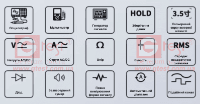 - 3,5-дюймовий кольоровий екран портативного осцилографа: двоканальний, висока частота дискретизації 280 Мвиб/с, автоматичний, нормальний та одноразовий режими запуску, вхід високої напруги ±400 В, автоматичний вимір та сканування, вертикальна чутливість 20 мВ/діл – 10 В/діл, довжина запису 128 тис., Діапазон горизонтальної розгортки 8/10 нс/діл- 20 с/діл, точність тимчасової розгортки 20 частин на мільйон.