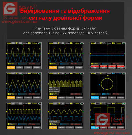 - Режим цифрового осцилографа: автоматичне вимірювання однією кнопкою, калібрування тимчасової розгортки, збереження даних, експорт даних, вибір мови, налаштування часу вимкнення, регульоване підсвічування, порт передачі даних, генератор сигналів забезпечують різні виходи частоти та форми сигналу. Пам'ять та інші функції, простота експлуатації, підвищення ефективності роботи. Широко використовується в автомобільному, промисловому устаткуванні, датчиках, важкому електрообладнанні, дрібному ремонті та низьковольтних системах. Вимірювання довільної форми сигналу іD