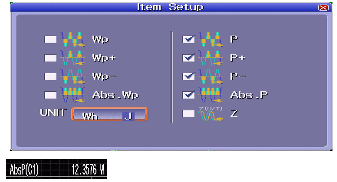 Загальні втрати потужності на будь-якому заданому циклі (втрати, відповідні T1 – T5 на рисунку 5) можна автоматично обчислити, просто вибравши оператор параметра P. Довільна форма сигналу циклу, що використовується для обчислення, вказується за допомогою курсорів діапазону, які визначають область обчислення функції « статистика за параметром області обчислення». DLM2000/DL9000 автоматично ідентифікує та витягує один цикл у цій галузі, обчислює параметр P (загальні втрати), як показано нижче, та відображає результат. Змінна T у виразі нижче – це час одного циклу, який DLM2000/DL9000 може автоматично визначити. Приклад рисунку 12, обчислення дало результат 12,3576 Вт (абсолютне значення).