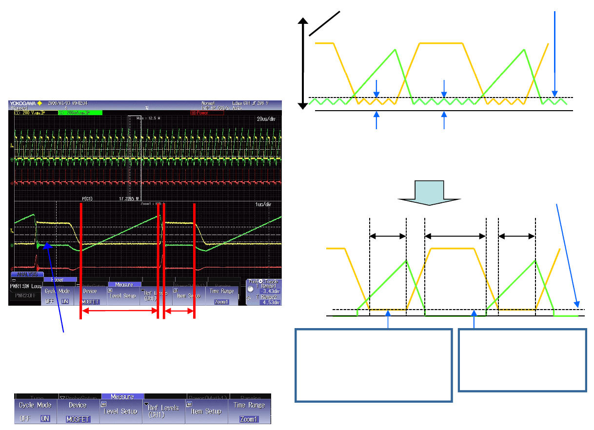 Вібрація викликана індуктивністю проводки (навантаження L), яка проявляється як дзвін тощо на формах сигналів у зоні перемикання. Це необхідно оцінити, відокремивши його від реальних втрат. Серія DL9000 може автоматично налаштовувати робочу зону перемикання (зону обчислення втрат під час увімкнення або вимкнення), що підлягає аналізу.