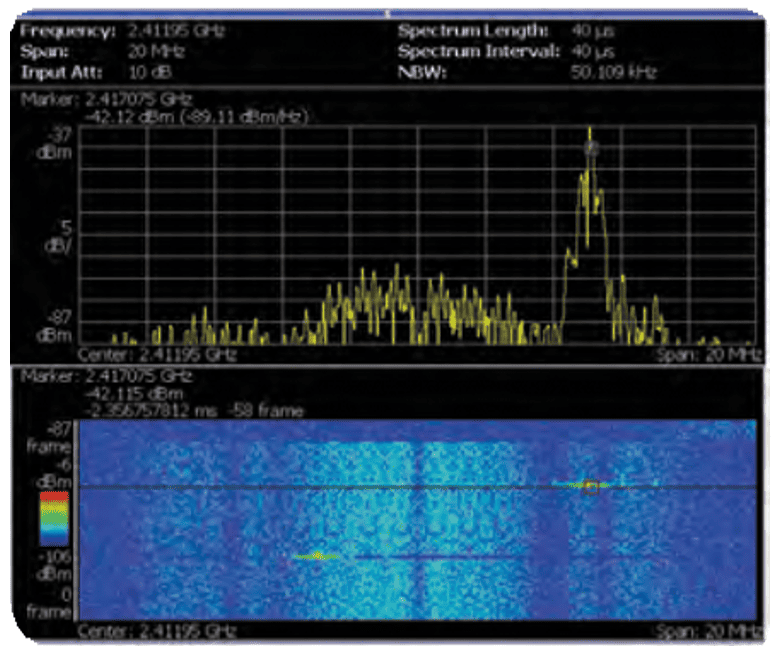 ЗЧМ та спектрограма для сигналів WLAN/Bluetooth. Запуск частотної маски був обраний для виявлення будь-яких змін у спектрі. Запуск здійснюється через перешкоду сигналу WLAN від перехідного процесу. Спектрограма показує часове співвідношення між перехідним сигналом та сигналом WLAN. Відображення спектра показує, що відбувається в момент, коли в смузі частот є сигнал перешкоди. ЗЧМ - це основний засіб для виявлення небажаних перешкод.