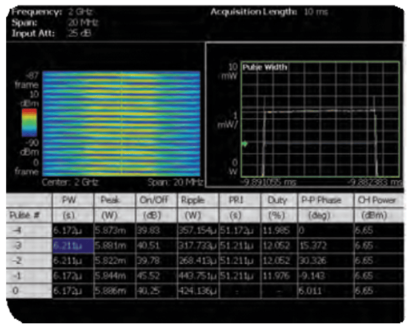 Аналіз потужного імпульсного сигналу визначення характеристик радара та інших імпульсних систем. RSA3408B автоматично вимірює ширину імпульсу, частоту проходження, потужність імпульсу та сім інших параметрів імпульсних сигналів.