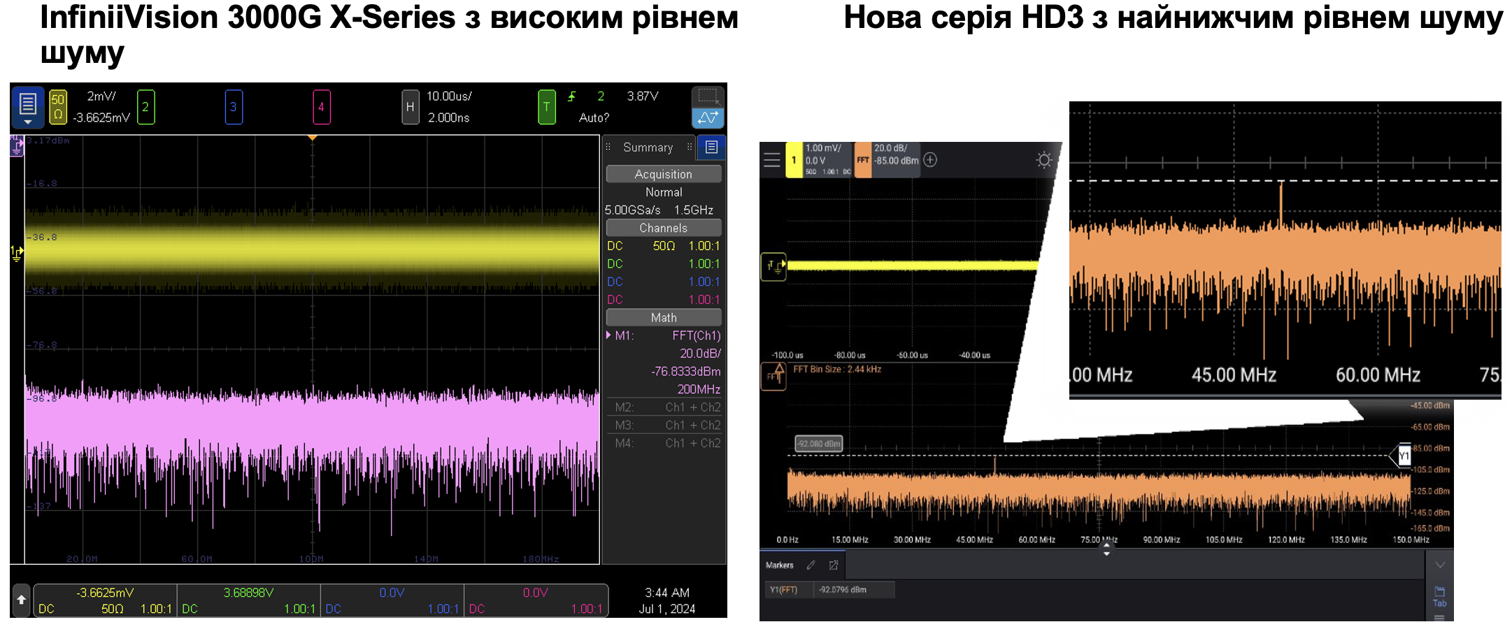 Рисунок 3. У цьому прикладі вимірюється сигнал 53 мкВ. Ліворуч осцилограф серії 3000G X при 2 мВ/справ має рівень шуму 372 мкВ уср.кв., що унеможливлює побачити тон 53 мкВ на швидкому перетворенні Фур'є (БПФ) через високий вхідний шум. Праворуч серія HD3 з рівнем шуму менше 50 мкВ уср. при цих налаштуваннях чітко показує надзвичайно слабкий тон 53 мкВ на БПФ через низький вхідний шум. Низький рівень шуму осцилографа дозволяє вам уловлювати навіть найдрібніші деталі сигналу.