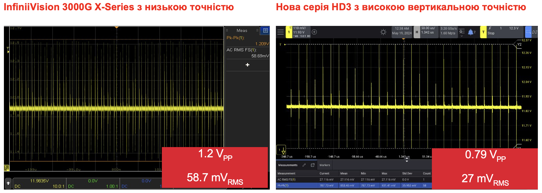 Рисунок 1. При порівнянні вимірювань, виконаних на осцилографі Keysight InfiniiVision 3000G X-Series і Серія HD3, що використовує ту саму установку зондування (пробники), виявила, що серія HD3 забезпечує більш точні вимірювання. HD3 має значно більш високу вертикальну роздільну здатність з 14-бітним АЦП і низький рівень шуму 50 мкВ уср. Навпаки, 3000G має 8 біт і 250 мкВ уср. шуму. Різниця суттєво впливає на точність вимірів.