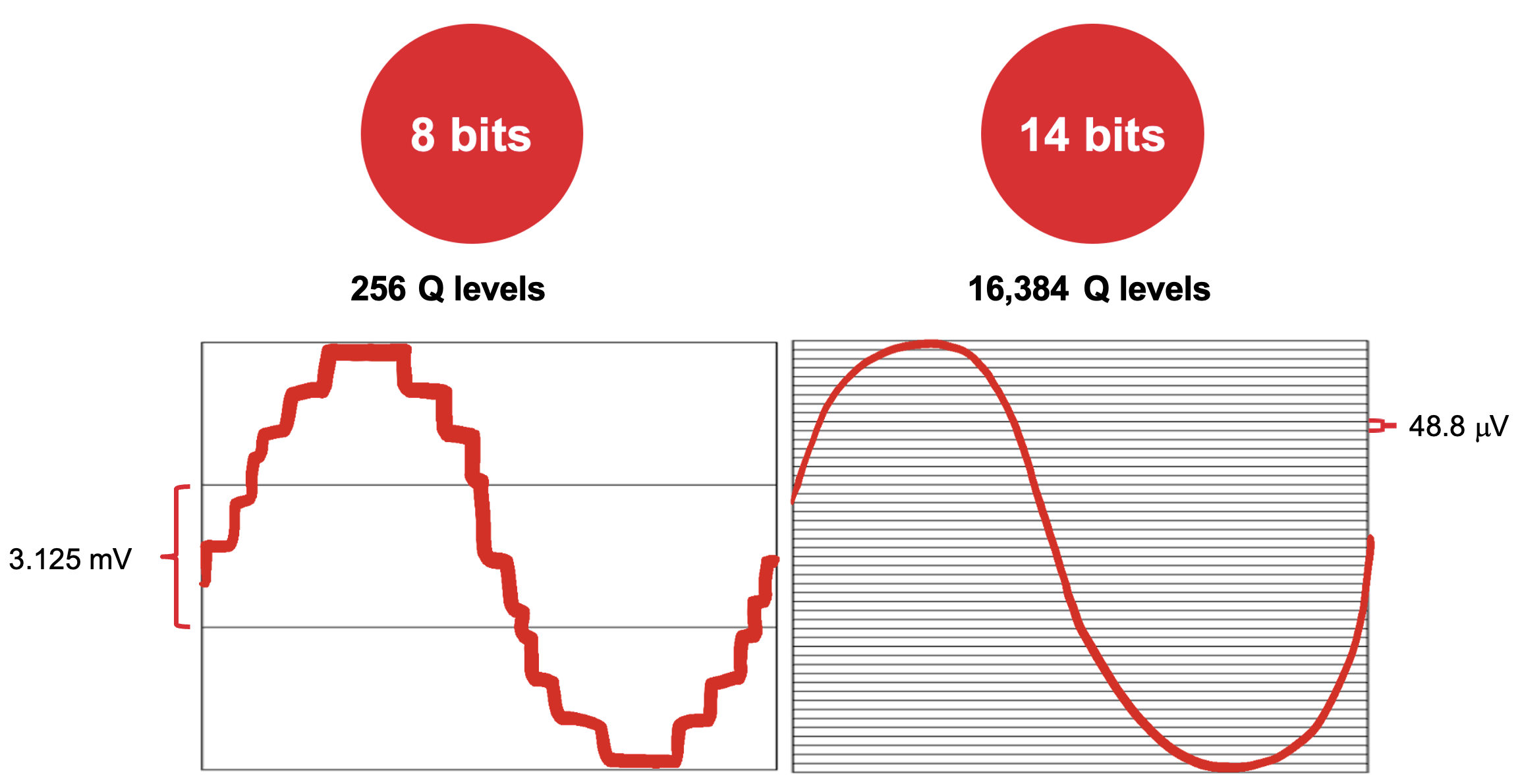 Давайте розглянемо приклад, показаний малюнку 2. Два осцилографа масштабуються до 800 мВ весь екран. Осцилограф з 8-бітним АЦП має роздільну здатність 800 мВ/(2 в 8-ій стінці = 256 рівнів Q), або 3,125 мВ. Осцилограф з 14-бітним АЦП, наприклад, Keysight InfiniiVision HD3 Series, має роздільну здатність 800 мВ / (2 в 14-му ступені = 4096 рівнів Q), або 48,8 µВ.