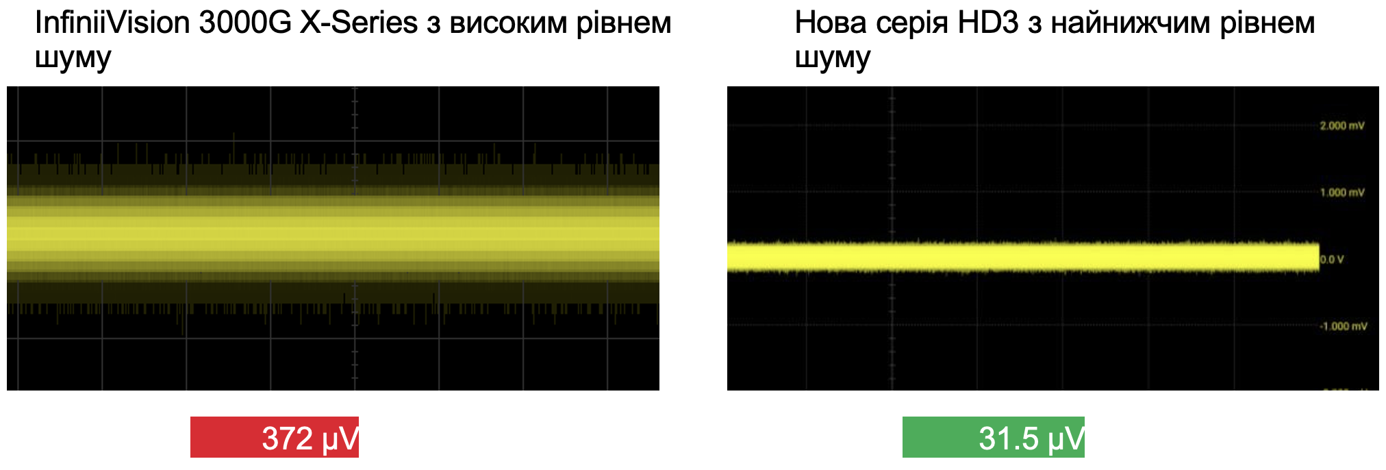 Рисунок 4. Ми провели вимірювання шуму змінного струму RMS при 1 мВ/діл та 50 Ом шляху на кожному осцилографі. Базовий рівень шуму осцилографа буде накладатися на кожен сигнал, що вимірюється вами, тому врахуйте це при порівнянні осцилографів конкурентів. Вхідні канали серії HD3 мають найнижчий рівень шуму в галузі, що зводить до мінімуму вплив на ваші сигнали та вимірювання.