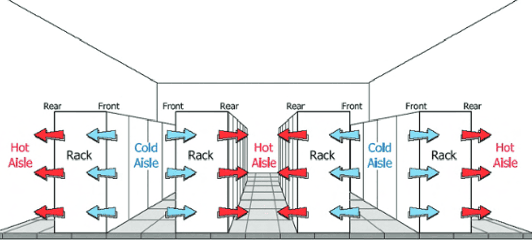 Центри обробки даних потребують ідеальних умов повітряного охолодження для безперебійної та ефективної роботи. Конфігурація гарячого/холодного коридору часто використовується в центрах обробки даних. Серверні стійки розташовуються в коридорах, причому їх фасади звернені один до одного. Холодні коридори одержують холодне повітря з блоку кондиціювання повітря комп'ютерного залу (CRAC), розташованого в нижній частині фальшпідлоги. Це холодне повітря охолоджує сервери на стійках. У той же час, задні частини серверів відкачують гаряче повітря в гарячий коридор, який потім прямує назад в блок CRAC.