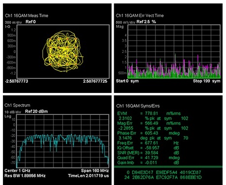 IQ модуляція є дуже ефективним способом для передачі інформації. Генератори SSG5000X здатні генерувати стандартні сигнали модуляції як: QAM, PSK, ASK, FSK. Швидкість передачі може бути виставлена до 120 Msps.