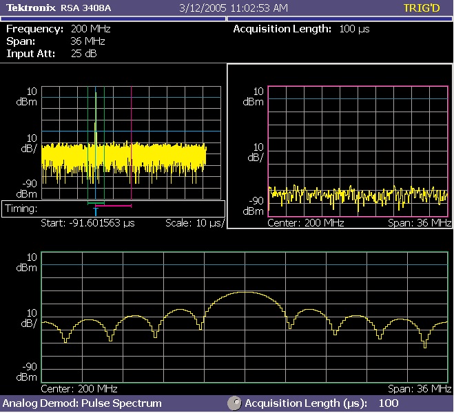 Аналізатор RSA3408A забезпечує захоплення сигналів зі смугою частот 36 МГц. У режимах відображення потужності часу, при оптимізації фільтрів для вимірювань у часовій області, аналізатор RSA3408A забезпечує роздільну здатність 20 нс. Це дозволяє аналізувати дуже короткі імпульси та докладно досліджувати їх форму.