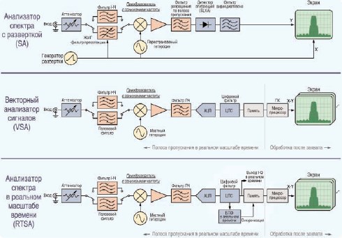 Щоб краще зрозуміти унікальні можливості аналізаторів спектра у реальному масштабі часу, слід ознайомитись зі спрощеними блок-схемами трьох основних типів сучасних аналізаторів спектру. Ці аналізатори багато в чому схожі, наприклад, у всіх є вхідний атенюатор, однак між ними є суттєві відмінності.