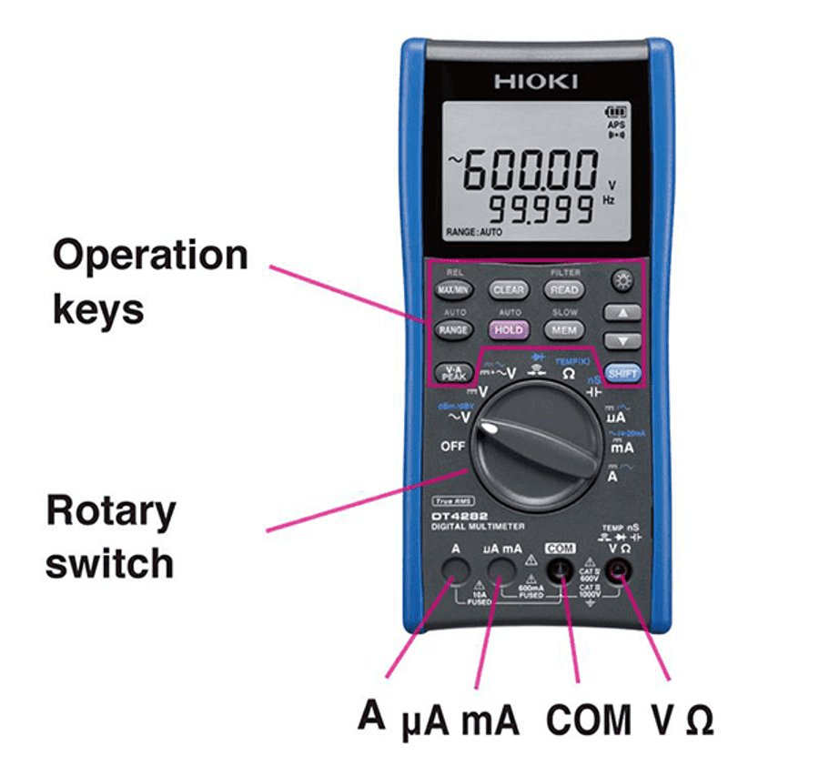 Увага: не підключайте жодного вимірювального проводу до клеми «A». Деякі моделі мають функцію затвора, призначену для запобігання ненавмисному підключенню вимірювального дроту до клеми «A», тоді як в інших моделях клема «A» немає повністю. Цифрові мультиметри Hioki мають внутрішній запобіжник, призначений для захисту від можливості ненавмисного підключення вимірювального дроту до клеми «A». Для отримання додаткової інформації, будь ласка, перевірте характеристики кожного продукту. Переконайтеся, що напруга ланцюга, що вимірюється, знаходиться в межах вхідних характеристик цифрового мультиметра.
